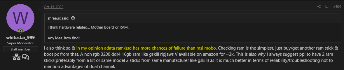 I also think so & in my opinion adata ram/ssd has more chances of failure than msi mobo. Checking ram is the simplest, just buy/get another ram stick & boot pc from that. A non rgb 3200 ddr4 16gb ram like gskill ripjaws V available on amazon for ~3k. This is also why I always suggest ppl to have 2 ram sticks(preferably from a kit or same model 2 sticks from same manufacturer like gskill) as it is much better in terms of reliability/troubleshooting not to mention advantages of dual channel.