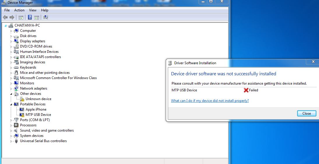 My HTC Desire 820 is not connecting to Windows as an MTP device. I have tried many solutions but still the problem persists. Windows has diagnosed it as "This device cannot start (Code 10 error)". I have tried reinstalling HTC device driver software, Uninstalling & reinstalling from Windows Device Manager but still when I connect the device , installation fails (Yellow exclamation triangle shows in Device Manager-->>Portable Device & red cross labeled as "Failed" in the installer dialog box. My iPhone 4 is working fine, I am able to open its files, folders in Windows explorer.
